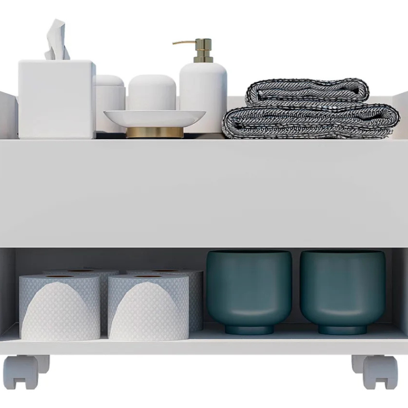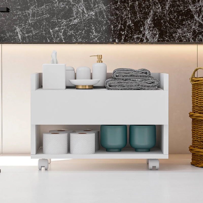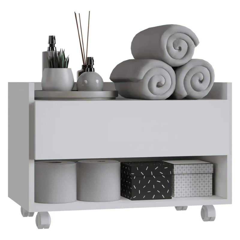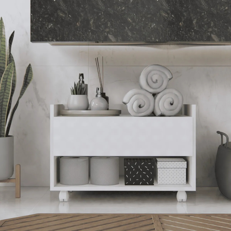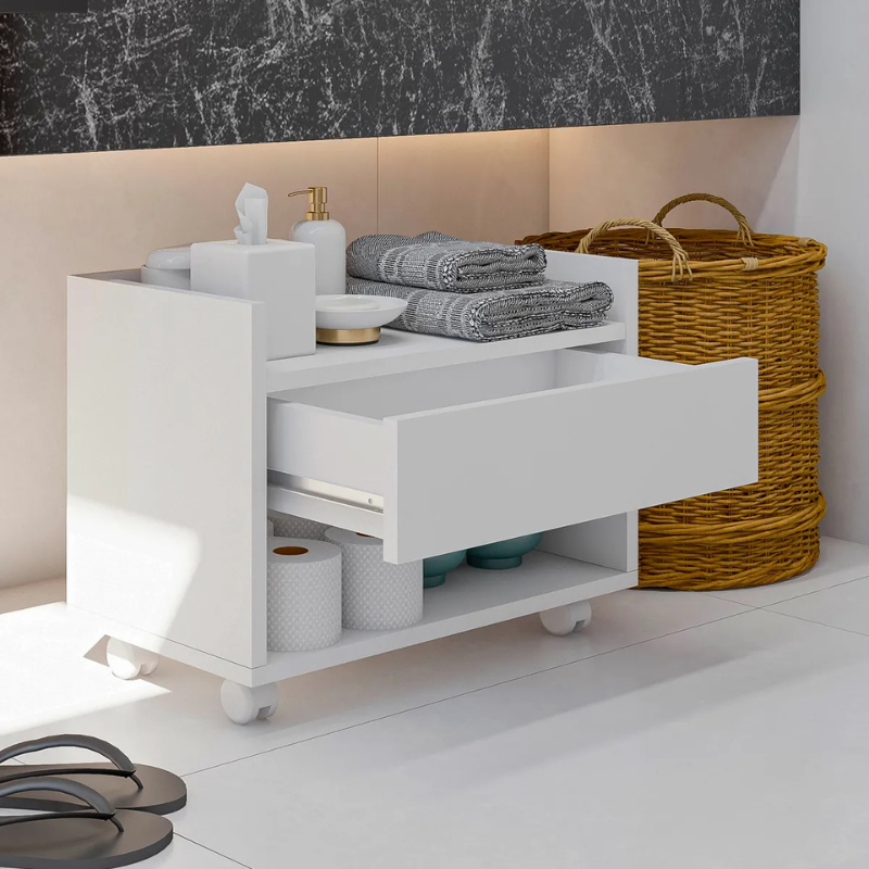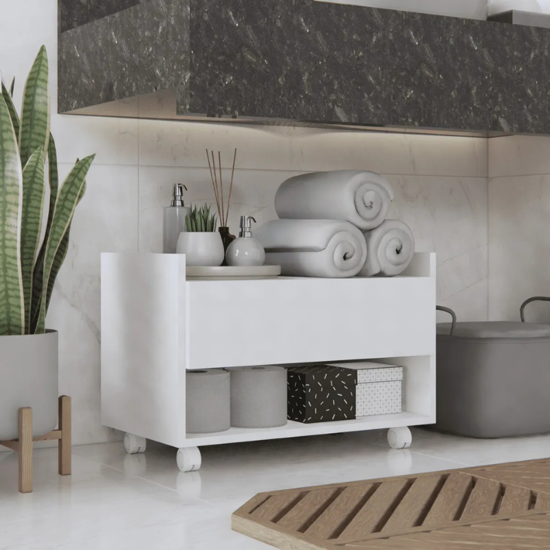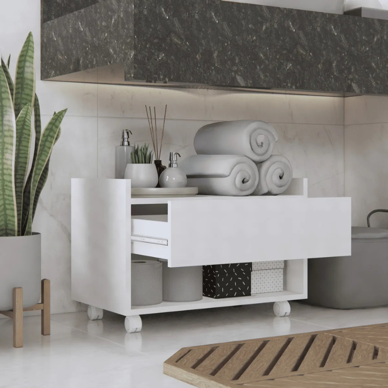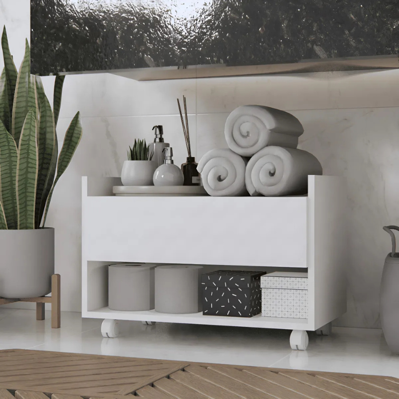 Multifuncional 2 em 1: Além de gavetas espaçosas para organizar cosméticos, papéis e produtos de limpeza, ele possui um porta-toalha integrado, otimizando cada centímetro do seu espaço.