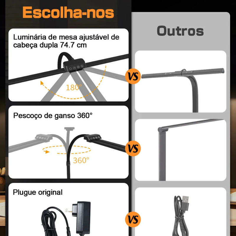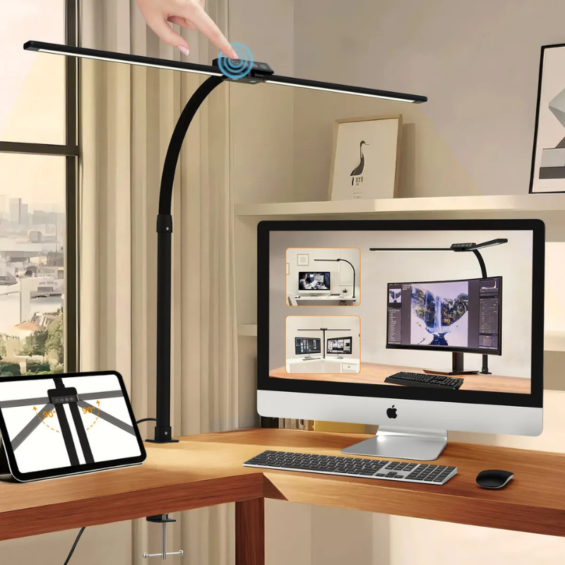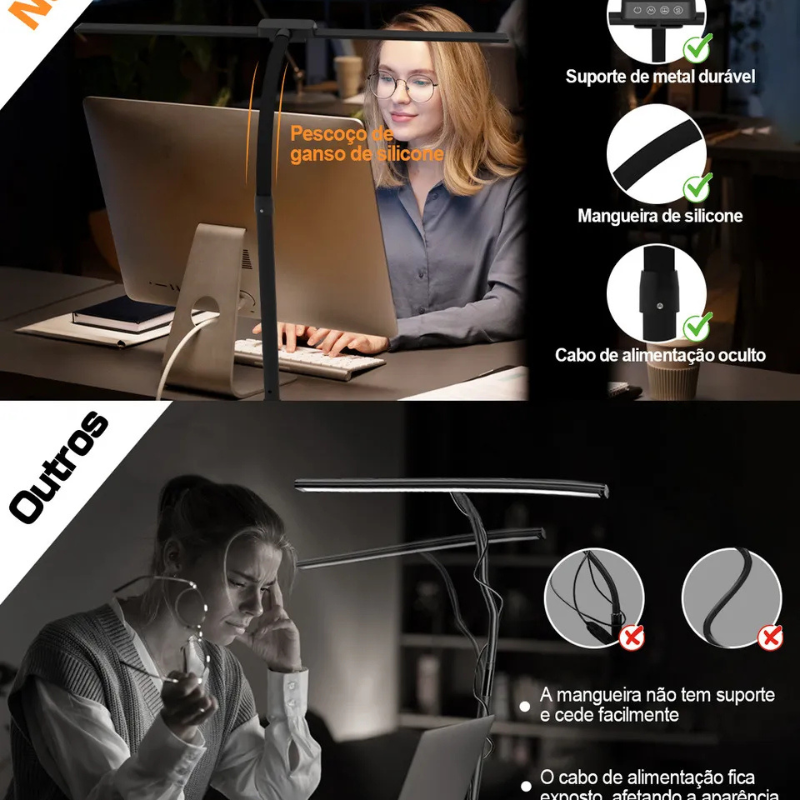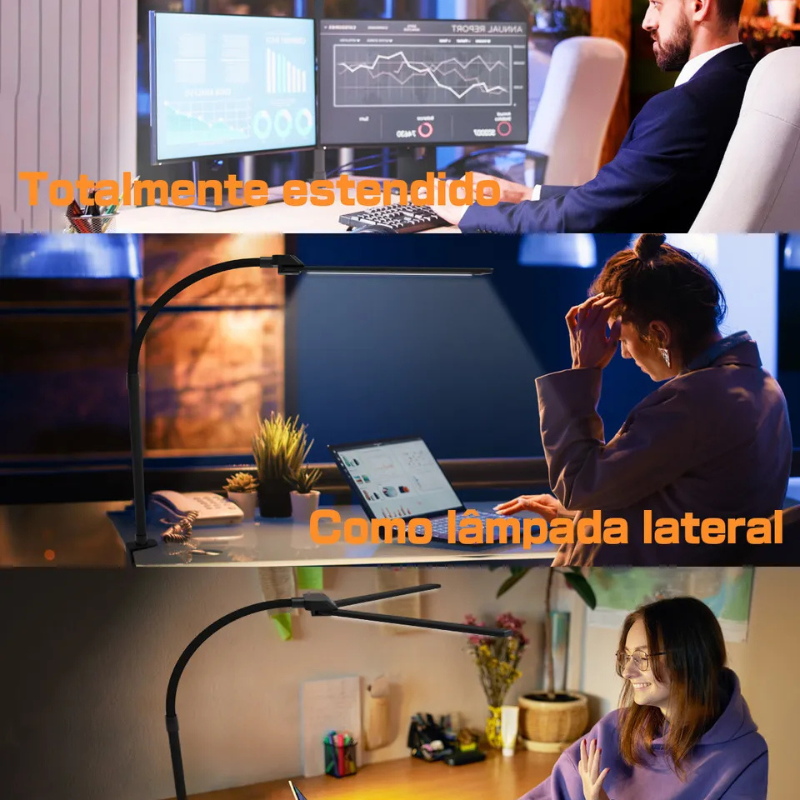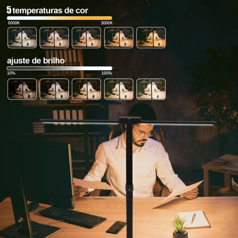 Transforme sua produtividade com a Luminária de Mesa LED de Dupla Cabeça 22W Superpotente! Perfeita para arquitetos, estudantes e profissionais do escritório, ela vem com clipe ajustável que se fixa em qualquer mesa ou prateleira, liberando espaço precioso. Oferece 5 modos de cor e brilho regulável para adaptar a luz ao seu momento: luz branca intensa para tarefas precisas, tons quentes para leitura confortável sem cansar os olhos, graças à tecnologia de proteção ocular. Flexível e articulável, direciona a iluminação exatamente onde precisa, com potência de 22W que ilumina grandes áreas sem esquentar. Bivolt (100-240V), durável e econômica, é o upgrade que seu setup merece – compre agora e sinta a diferença na sua rotina!